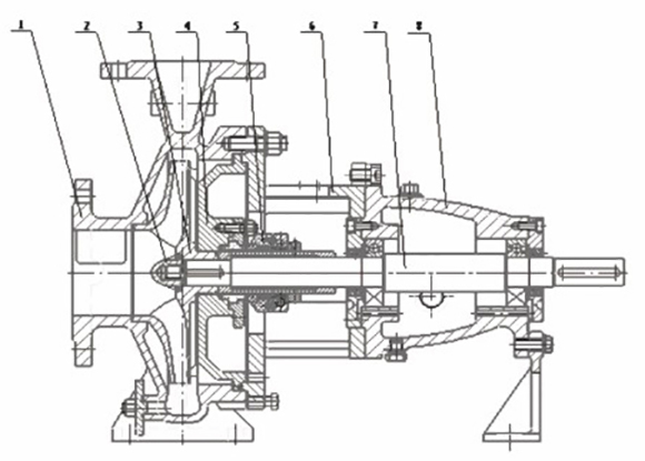 (1)泵體;(2)葉(yè)輪螺母;(3)葉輪件(jian);(4)泵蓋;(5)密封部件(jian);(6)中間支架;(7)軸;(8)懸(xuán)架🏃🏻部件